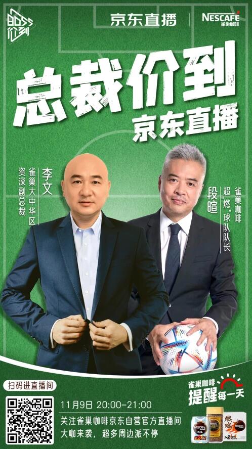 11月9日晚上8点,雀巢大中华区资深副总裁李文将携手超“燃”球队队长段暄空降直播间,在世界杯即将到来之际,为热爱咖啡的球迷朋友们大放价,更是带来官方正品球衣,官方指定足球,还有限定足球乐高等千元足球周边好礼。