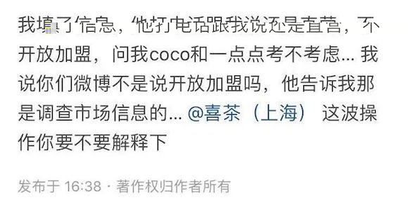 在知乎上,已经有网友表示:提交了报名信息,却被打电话告知还是直营,不开放加盟,CoCo和1点点考不考虑。