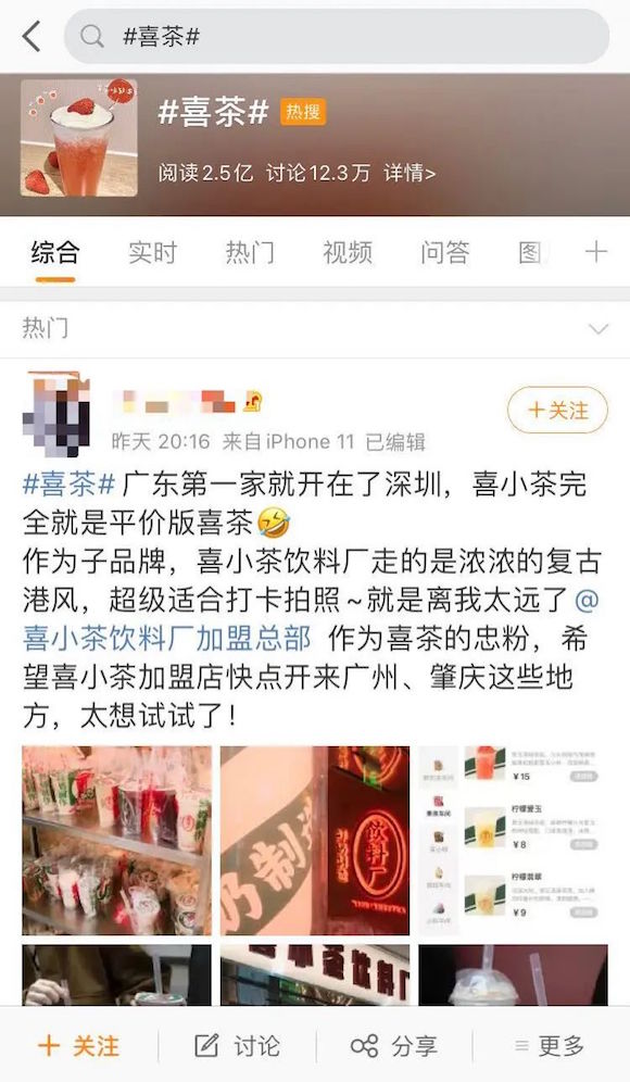 在下图的微博内容里,不仅@喜小茶饮料厂加盟总部,还希望喜小茶加盟店快点开到广州。乍一看,文字配图,有声有色,热度又高,真让人以为喜小茶悄悄开放加盟了。
