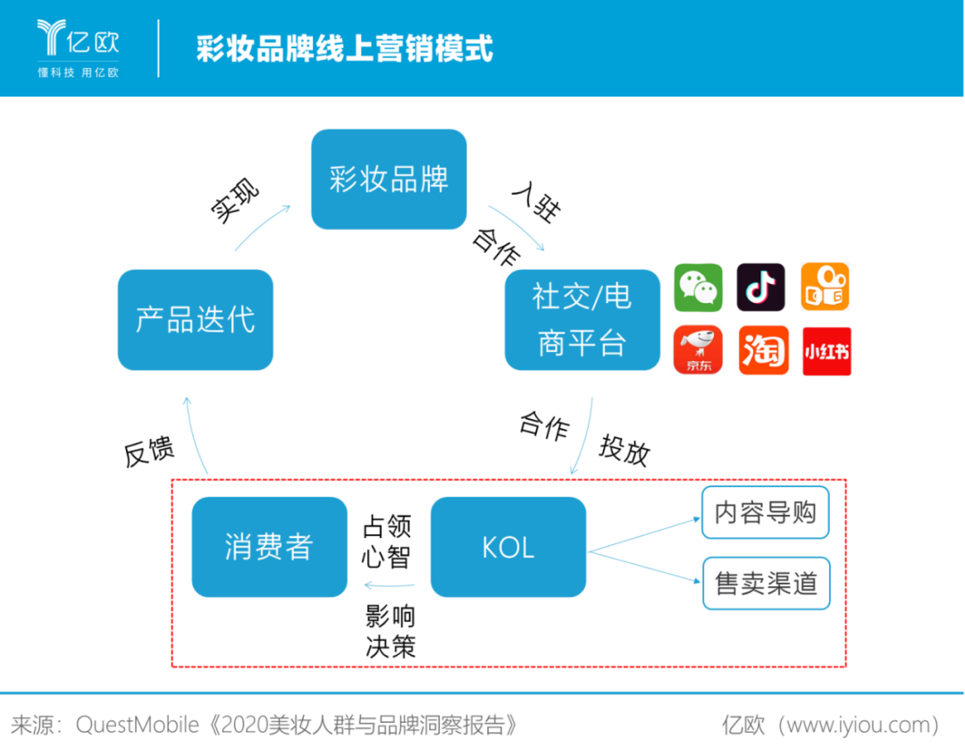 与传统线下销售渠道从新品投放到消费者的单向性模式不同,彩妆线上营销的主要模式是进驻到不同平台与KOL合作,利用其内容导购和售卖渠道二合一的属性,引导消费者决策,而消费者的评价又可以反馈给品牌,推动品牌进行产品迭代,从而形成一个互相作用、紧密联系的闭环。
