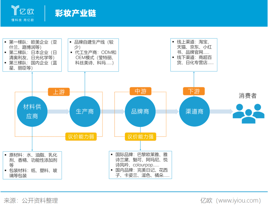 彩妆产业链上游主要是材料供应商以及生产商,而材料供应商包括原材料供应商和包装材料供应商。
