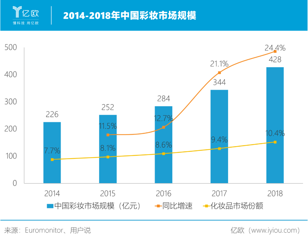 据Euromonitor统计,2018年中国彩妆市场规模达到428亿元,在整体化妆品市场占比为10.4%,是第三大品类,低于同期美、日、韩化妆品市场20%左右的占比。