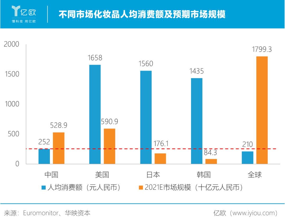 另据Euromonitor统计,目前中国已经是全球第二大化妆品市场,约占全球化妆品市场总规模的1/5,且增速远超美、日、韩。但相比之下,人均消费水平只达到美、日、韩的1/6左右,需求潜力还远未充分释放。