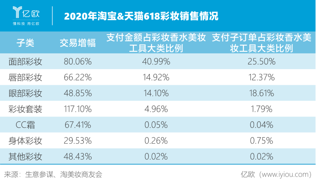 据美业颜究院数据,3月22日-5月20日60天内,淘宝及天猫彩妆销售额超过65.2亿元,环比上升24.54%。今年618当天,淘宝和天猫平台上各子类彩妆产品交易额也实现大幅增长。