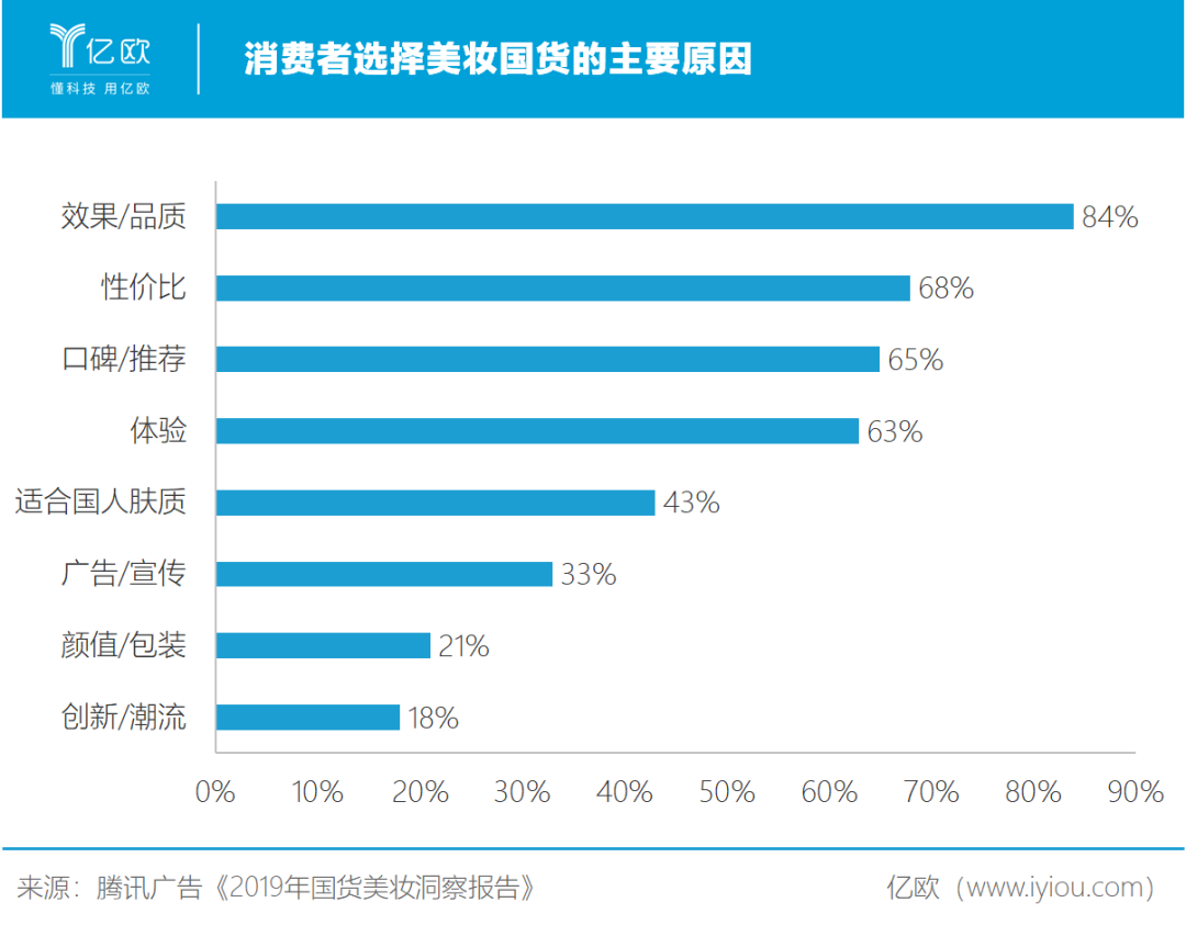 腾讯广告的“消费者选择美妆国货的主要原因”调查结果显示,效果和品质是吸引消费者购买美妆国货的首要因素。