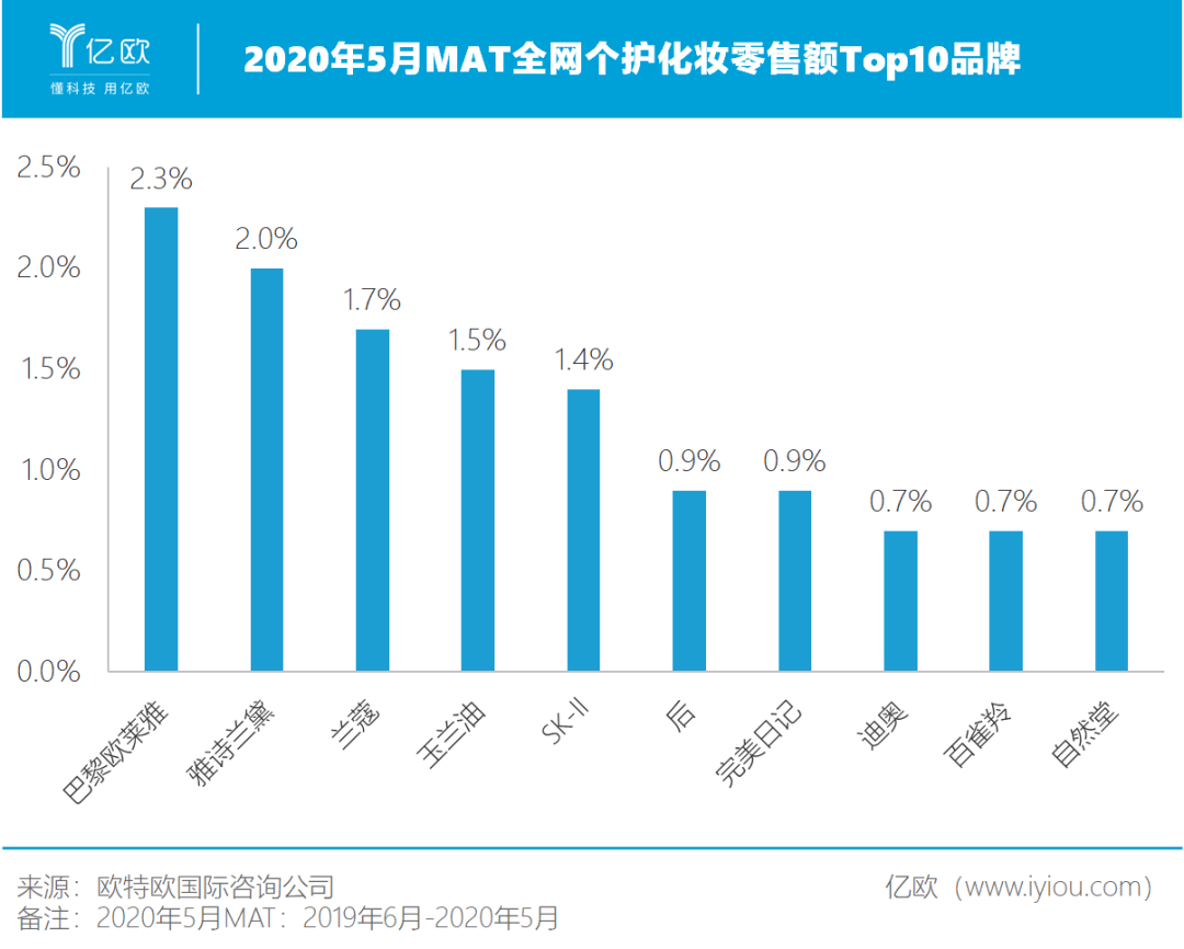 据欧特欧国际咨询公司统计,近一年(2019年6月-2020年5月),零售额最高的巴黎欧莱雅也仅占到全网个护化妆品类产品零售总额的2.3%,可见市场之分散和竞争之激烈。