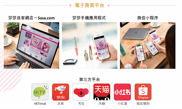2016年,莎莎国际入驻了京东全球购与苏宁易购。而在一年之后,才入选择进驻了女性消费者更为聚集的天猫,除此之外,还搭建了微商城,推出手机APP,并与网易考拉等达成合作。