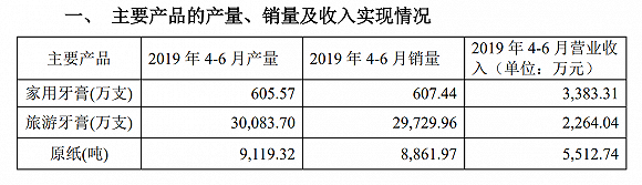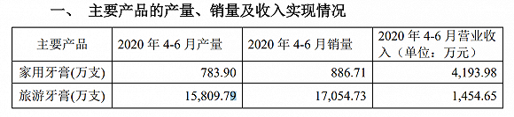 另据8月26日披露的2020年二季度最新的经营数据显示,该季度家用牙膏产销分别为783.9万支和886.71万支,旅游牙膏产销分别为15809.79万支和17054.73万支。环比2020年一季度数据,两主要产品二季度的产销数据均有增长,但同比2019年的经营数据两产品各有千秋,2019年第二季度家用牙膏的产销只有605.57万支和607.44万支,当期旅游牙膏的产销数据分别为30083.7万支和29729.96万支。
