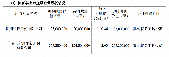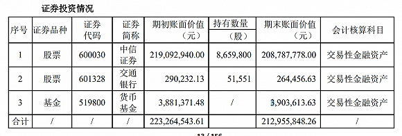 至于持股,两面针手握的A股有中信证券865.98万股,持有交通银行5.16万股,另有柳州银行和广西北部湾银行的股份以及货币基金。其中会计核算科目为交易性金融资产的期末账面价值减少了1000多万元。