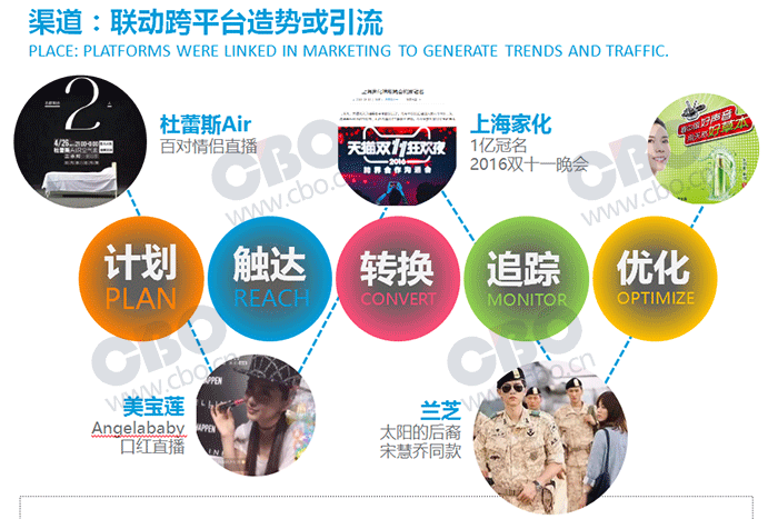 另外,目前阿里巴巴、聚美优品等平台推出的跨平台互动也吸引了不少品牌尝鲜。比如美宝莲邀请Angelababy做口红直播、上海家化1亿元冠名“双十一”晚会等等。