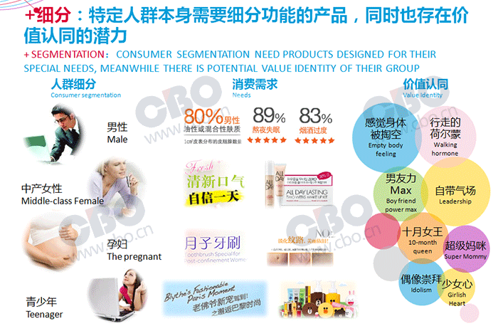 针对细分人群的不同消费需求和价值观认同应该被重视。唐东举了一系列的例子,如针对男性消费者的油性肤质产品、“行走的荷尔蒙”价值观;针对青少年的动漫IP、“少女心”元素;针对中产女性的自信、男友力等价值卖点。