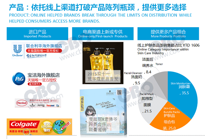 在过去一年多以来的线上渠道增长过程中,护肤、护发类产品是主要贡献来源。2016年上半年,线上非食品类产品的销售额同比增幅达到32.3%,其中护肤产品贡献了几乎一半的增长幅,占15%,护发类产品也贡献了2.6%的增幅。
