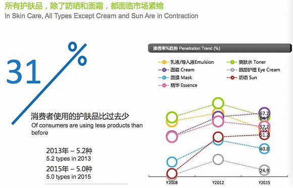 对护肤品生产商而言,坏消息是除了防晒和面霜,所有护肤品都面临市场紧缩,消费者使用的护肤品比过去少了31%。