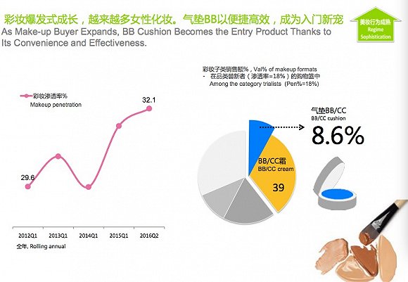 彩妆爆发式成长,越来越多女性化妆,气垫BB以便捷高效的优势成为入门新宠。