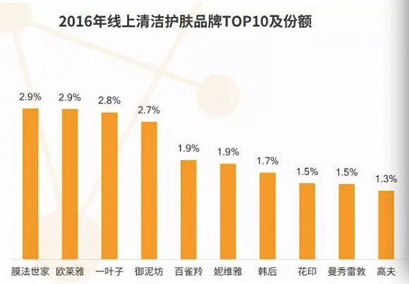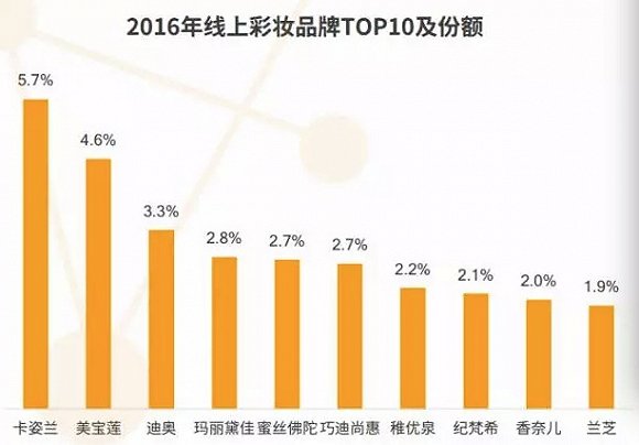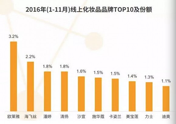 根据监测,2016年1-11月,合资、外资品牌占据线上化妆品市场56.6%的份额,而本土品牌为43.4%。在同期线上销售TOP10化妆品品牌中,巴黎欧莱雅以3.2%的份额高居榜首,本土品牌仅有卡姿兰以1.5%的份额,位居第七。