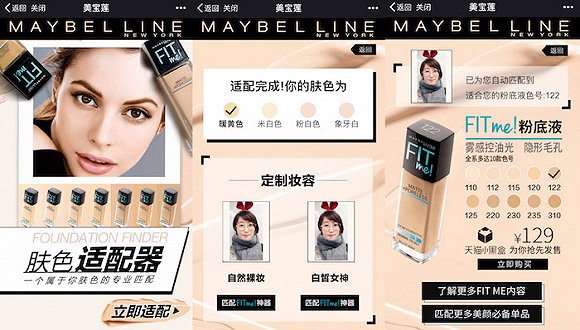 为了提升消费者的线上体验,美宝莲还发布了一款线上“肤色适配器”帮助用户选择合适色号。消费者只要在线上传照片,系统就会自动适配肤色选项,并推荐适合的粉底液色号。