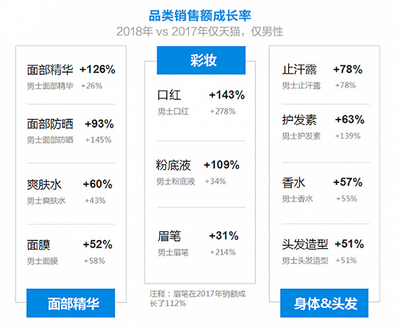 根据天猫发布的数据,2018年,男士理容产品中头发造型、香水和止汗露三个品类的增长最稳定,分别保持在51%,55%,78%的同比增速;男士眉笔、男士口红、男士面部防晒同比增速分别达到了214%、278%和145%;男士专用化妆品品牌的同比增幅在56%,专用品牌不仅在护肤品类快速渗透,在彩妆品类也得到了扩充;此外,男士理容呈现高端化趋势,过去一年天猫整体理容产品的平均价格上升16%。但由于男士专用高端品类较少,不少男士会直接选择女性高端化妆品品牌。