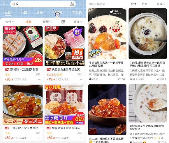 在姜健看来,桃胶品类在线上的走红,跟电商平台的内容营销有一定关系。2016年,淘宝内容营销项目“淘宝二楼”上线,其中第六集《桃花泪》就以“桃胶”为推荐商品,当时推动相关桃胶商品销售量达到近百万元。