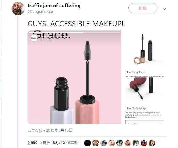 一名造型师在其推特截图并发布了Grace Beauty的产品内容,并附文“GUYS.ACCESSIBLE MAKEUP!!”这条推特获得9000个的转发和3.2万个点赞。