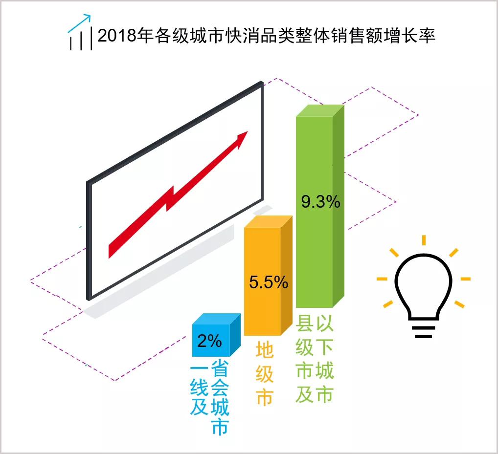 最近,尼尔森中国一份最新零售研究数据显示,与2017年相比,快消品类整体销售额在2018年增长6%,其中下线城市销售额增长9.3%,而一二线的城市的销售额增长率仅为2%。