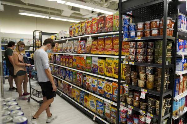 资料图片:8月11日,人们在美国纽约的一家超市选购食品