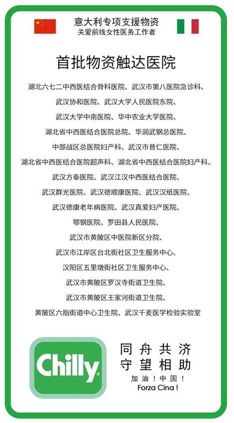 一场突如其来的疫情,给中国人民带来巨大的挑战,数以万计的医护人员在一线奋战,全力抗疫。据了解,在这次抗击疫情的前线医护人员中,女性医护人员占比达60%,其中女性护士占比更是高达90%。在艰苦的抗疫的工作中,她们努力克服困难,连续奋战,顽强坚守在抗疫前线。了解到这些情况后,Bolton集团旗下意大利国民私密护理品牌Chilly,心系一线女性医护人员,紧急调拨上万瓶原装进口护理洗液,第一时间组织专车运往湖北疫区。