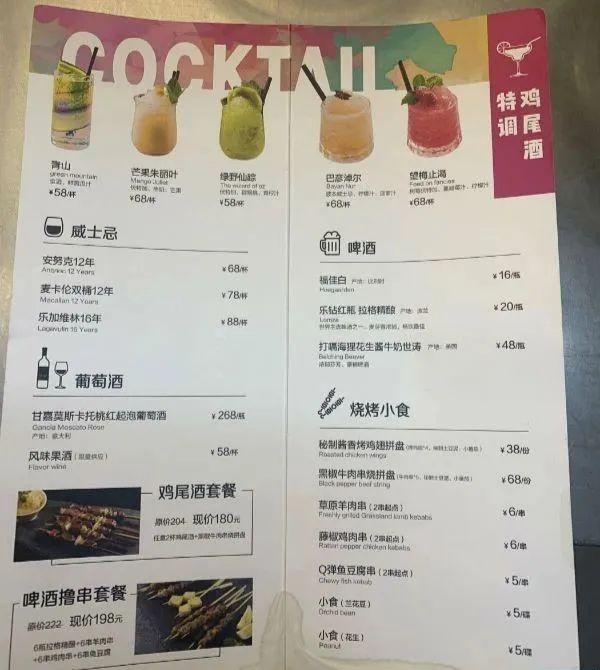 据了解,西贝酸奶屋除了此前一直售卖的瓶装啤酒外,店内推出了红酒、威士忌以及度数相对较低、颜值相对较高的调制鸡尾酒,还搭配烧烤小食推出了鸡尾酒套餐。