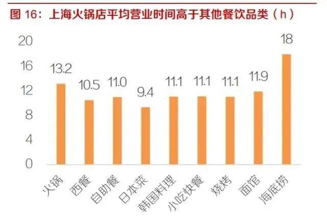 以上海为例,火锅店的平均营业时间为 13.2 小时,而海底捞甚至高达 18h,显著高 于其他餐饮品类,营业时间越长,翻桌的次数越多,也带来了较高的翻台率。