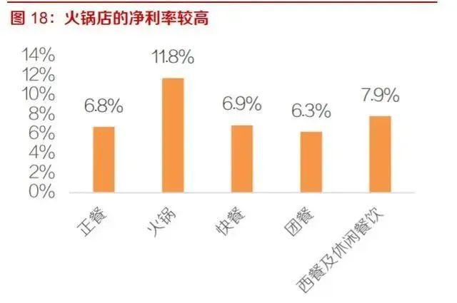 2)较低的人力成本也提高了火锅店的盈利能力,2017 年火锅店的净利率达到 11.8%,亦明显高于其他餐饮品类,是唯一净利率超过 10%的餐饮形式。