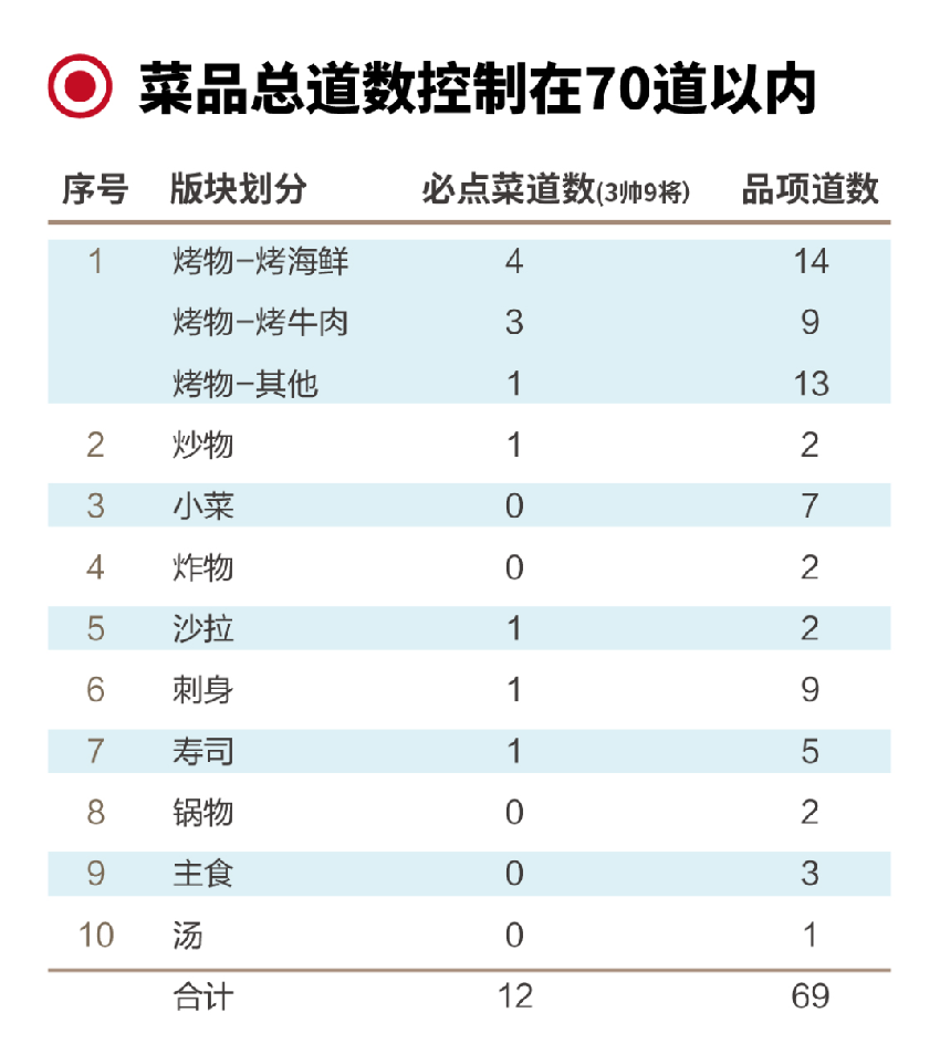 除此之外,根据品牌定位及招牌、特色产品安排,结合营业面积及工作区站进行调配,从降低厨房人力成本,增加综效出发,将菜品总数控制在70道内。