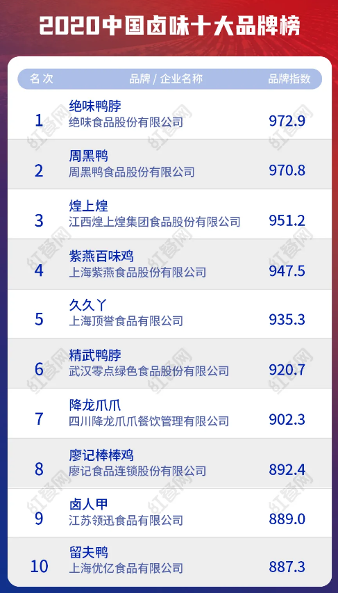 8月13日,在“2020中国餐饮营销力峰会暨中国餐饮(品类)十大品牌颁奖盛典”上, “2020中国餐饮(品类)十大品牌” 正式揭晓。近年来表现火热、潜力巨大的卤味品类也评出了十大品牌,并再次引发热议。