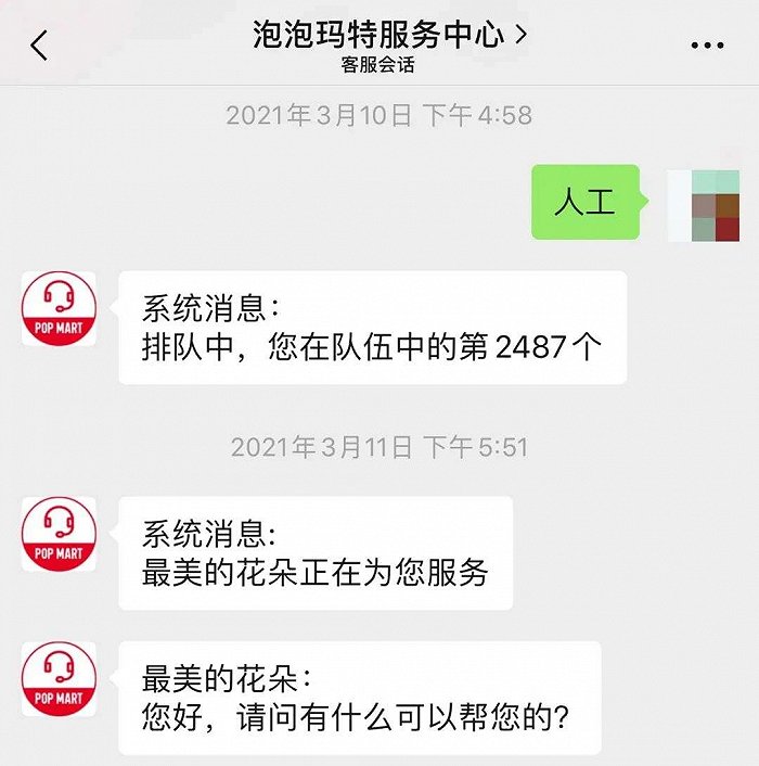 大量的订单涌向工厂,工厂的产能也开始吃紧。某文创品牌的工作人员对「新熵」表示:“最近两年许多玩具厂的盲盒订单量骤增,工厂的效率跟不上,所以检验环节就会放低标准。我们的订单也出现过瑕疵率过高的情况,就算我们不急,工厂的其他合作商也急,所以工厂的整个品控就大大下降了。”此外,泡泡玛特近两年的售后服务也备受诟病,有玩家吐槽:“我找泡泡玛特小程序人工客服,每次前面基本都有两三千人排队,有一次下午5点排队,结果第二天下午6点才排到。玩家群里很多人吐槽,泡泡玛特市值都这么高了,就不能多请一些客服?”