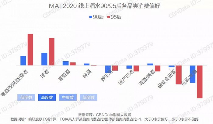 调查数据显示,年轻消费者引领健康微醺热潮,对低度数酒水偏爱有加,果酒、葡萄酒、啤酒这几类低度数酒也受年轻人偏爱, 洋酒是年轻人偏爱的高度数酒。