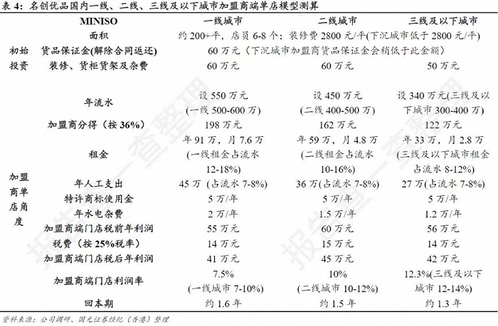 根据国元证券计算的名创优品单店模型,相对于一线城市,二线和三线城市的租金、人工等成本较低,门店利润率高、回本周期短,吸引了不少加盟商。