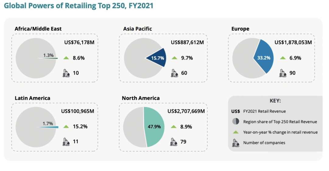 梳理此次榜单,《零售圈》发现,欧洲零售商上榜数量最多,和去年持平,为90家,位居第一,包括施瓦茨集团、奥乐齐、阿霍德德尔海兹等知名零售商。北美共计79家,数量位列第二,包含沃尔玛、亚马逊、开市客、家得宝、克罗格、沃博联、塔吉特等企业。亚太区域共计60家,排名第三,包括京东、7-ELEVEn母公司柒和伊控股、永旺等。拉美、中东/非洲区域分别为11家、10家。