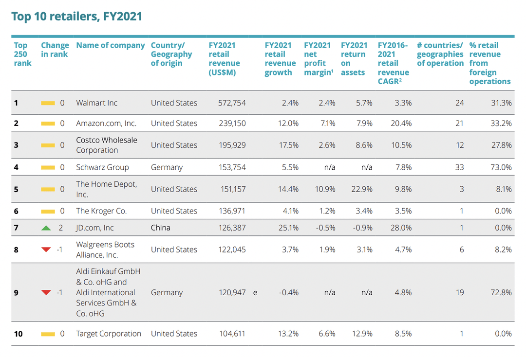近日,德勤发布《2023全球零售力量》报告(Global Powers of Retailing 2023)。该报告基于对全球零售业2021财年(2021年7月1日-2022年6月30日)的财务业绩和运营进行排名,统计出全球250强零售榜单,其中沃尔玛仍然位居第一,亚马逊、开市客紧随其后,京东成为增长最快的零售商之一,由去年的第九位升至第七位。