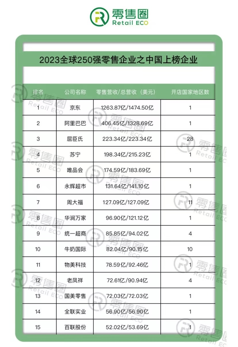 中国凭借10.8%的增长率,成为了亚太地区增长最快的三大零售市场之一,主要由阿里巴巴推动,天猫超市促进零售额强劲增长、淘菜菜年度活跃用户数量9000万。此次250强榜单中,中国(含大陆、香港、台湾)共计15家零售企业上榜,较去年16家上榜数量递减1家,其中滔博运动跌出榜单。另外,15家上榜企业中共计7家进入前100强,分别是京东、阿里巴巴、屈臣氏、苏宁、唯品会、永辉超市、周大福。