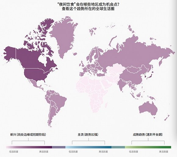 目前市面上已经出现了颇具创意的针对夜间场合的产品,比如零售商Lidl在西班牙推出的褪黑素舒缓果汁。2015年,美国出现了一个名为NightFood的零食棒系列。该系列承诺解决晚饭后还想吃饭的问题,使节食顺利进行,还可促进睡眠。在墨西哥和哥伦比亚,Kellogg品牌All-Bran麦片系列的几种产品重新包装上市,包装采用较暗的色彩,主推晚餐燕麦,声称该类产品能改善消化,让消费者有“一种轻松复苏的感觉”。