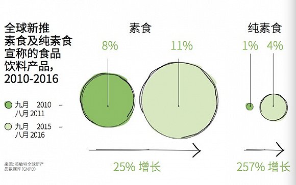 品牌主推植物成分还引发了消费者对素食和全素产品的兴趣。这就是所谓的弹性素食生活方式。2015年9月-2016年8月的“素食”概念和“全素”概念的产品数量比2010年9月-2011年8月分别增加了25%和257%。