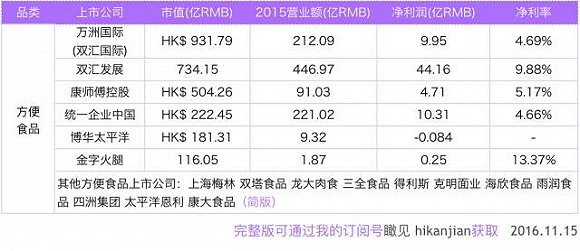 全行业当年实现利润210.30亿元,同比增长22.3%,全行业平均主营业务收入利润率7.46%。利润率,米面制品制造、速冻食品制造、方便面及其他方便食品制造分别为5.71%、7.20%、8.20%。