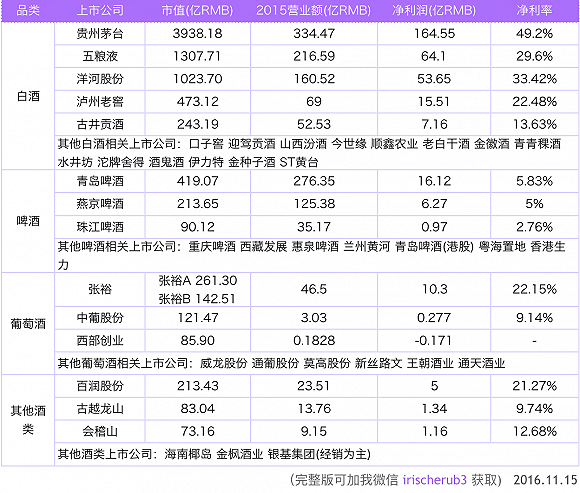 有烈酒品类的国家通常烈酒会主导市场,在中国白酒占据了酒饮料市场60%以上的份额,其利润水平也远远高于啤酒、红酒,是包装食品饮料行业中大型上市公司最多的品类。中国酒类上市公司情况(选择2016.11.15的公司市值):