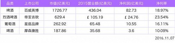 啤酒:2014年,480家规模以上啤酒企业总收入1886亿元,净利润138亿元。2015 年1至10 月,啤酒制造业主营业务收入1660 亿元,同比增长1.39%。参照美国啤酒行业现状,中国啤酒行业集中度将逐步提升,集中度提升后啤酒企业依靠品牌优势可逐步提高净利率至10%~15%。