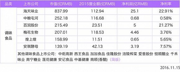2014 年我国调味品及发酵制品行业收入规模达到 2,649 亿;2015 年 1-10 月营收 2,303 亿,利润总额达 9.08%。