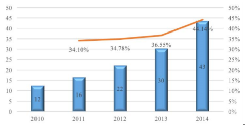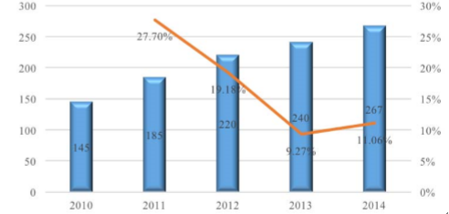 2010年-2014年婴儿纸尿布市场规模(单位:亿元)