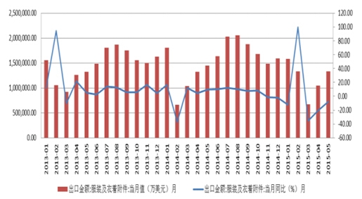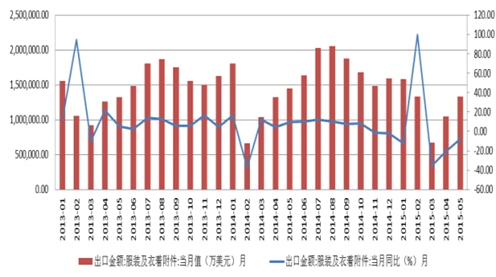 服装及衣着附件出口金额(月)(2013~2015.5)