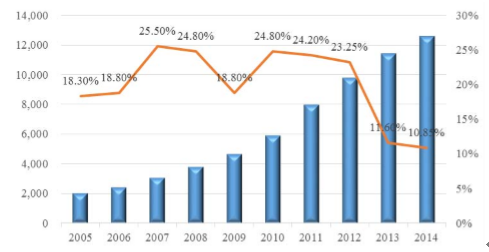 近十年,中国居民收入平稳增长。根据国家统计局数据,城镇居民人均可 支配收入由 2005 年的 10,493 元增长到 2014 年的 28,844 元,年均复合增长率为 11.89%。