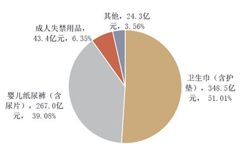 根据中国造纸协会生活用纸专业委员会统计,2014 年我国一次性卫生用品市场规模达到683.2 亿元,成人失禁用品占6.35%。