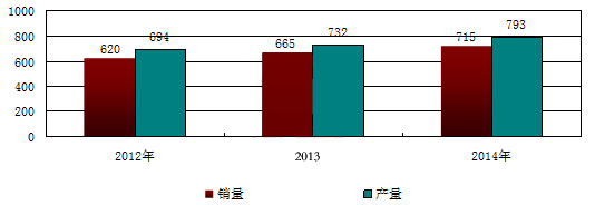 2012-2014年我国卫生巾产销量分析(亿片)
