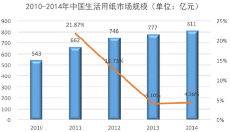 2010 年至 2014 年,中国生活用纸市场规模不断增长,2014 年达到 811 亿元 的市场规模,市场规模增速由原来的高速增长向中高速增长转变。