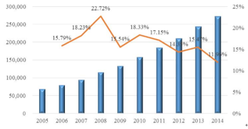 根据国家统计 局数据,近十年中国社会消费品零售总额始终保持在 10%以上增速,2014 年我 国社会消费品零售总额达 27.19 万亿元,比上年增长 11.96%。